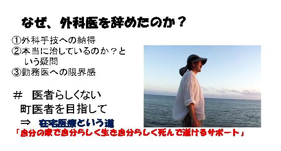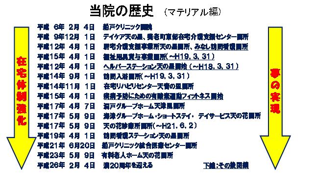 フナクリの20年を振り返って 船戸 崇史 早いもので今年の2月4日で開業して満20周年を迎えました。まずもって、この世あの世を問わず育てて頂いた皆様(御霊)に深く感謝いたします。 ありがとうございました。この機会に一度当院の20年の歴史を簡単に振り返ってみたいと思います。 【 私の理想的医師像? 】 まず、私が抱いていた医師像についてお話ししましょう。私の場合、 しかし、ハードルの高い医学部でしたが私立なら可能性があるとは言われたものの、合格させて頂いたのは愛知医大だけでした。夢をかなえてくれた本当にありがたい母校です。 私の実家は家業が医療ではないこともあって、私の進路は自由度が高かったです。「あなたが良いように 私自身の進路は、消化器外科を専攻しました。ブラックジャックに 【 なぜ外科医を辞めたのか? 】 いくつかの気持ちが混在していますが、それを敢えて項立すると3つになります。 そのうち私は考えるようになりました。じゃあ一体「私に出来る事」とは何か? 患者さんはだれもが「自宅で死にたい」と申されました。死の覚悟ができているのです。しかし、病院の勤務医は往診はできません。多くはその地域の開業医に退院後の治療をゆだねます。しかし、多くの場合、病状が末期ともなると、点滴や尿の管、モニターの管などでぐるぐる巻きの状態です。こんな状態では帰りたくとも開業医にも、家族にも迷惑だし、本人も不安です。 「自分の生まれた家で、自分らしく生き、自分らしく死んで逝けるサポートをする医療」これが開業時のスローガンとなったのです。 こうして、メスを手放しH6年2月4日、岐阜県養老で開業することになりました。 【 なぜ養老で開業したのか? 】 私は洞戸(現関市)の生まれです。開業するなら美濃市付近と決めていました。しかし、結果的に、岐阜県養老町で開業することになりました。 博子先生の父親(内科医)がこの地に土地を将来病院建設用地として所有しておられ、お貸し頂けたのです。しかし、私にとって西濃地方は縁のある土地ではあるものの(何といっても、博子先生は平田町今尾出身ですから)最終的にこの場所に根着こうと考えた理由は、開業予定地の住所が「 【 平成6年2月4日開院 】 しかし、開業したものの借入金額が大きく当院の損益分岐点は80名。つまり1日80名の患者さんを診察しないと赤字になるのです。開業早々80名もの患者さんに来ていただく計画自体に無理があったのかもしれません。来て下さるのは小児科の患者さんばかり。それはそれで有難いのですが、私はそもそも小児科が専門ではありません。子供は大好きですが、小児の診療となると別で、専門外の診療ほど辛いものはありません。しかし返済のためにはそんなことは言っていられませんでした。加えて本当にしたかった在宅末期医療はと言えば、依頼は1件もありません。最初は意気込んで「頑張ろう」の勢いで我慢しましたが、掛け声だけでは何ともならなくなってきました。「一体何のために開業したのか?」「こんなことなら開業しなきゃ良かった・・」「しかし今はどうか?数字の計算ばかり、一番軽蔑する医者をしているじゃないのか?」「いっそのこと医者を辞めた方が楽だ」とまで思いました。しかし多額の返済を医業以外に返済できる方法はなく、スタッフもいます。一体どうしたらいいのか?この思いは日々募り、私は徐々にうつ状態となったのです。 【 これで順調な人生? 】 何かが落ちました。「そうなんだ・・そうだったんだ・・」不思議とそう思えました。心の中から「そうか、それじゃ、やるしかないじゃん・・」という思いになりました。 すると、何と在宅診療の依頼が入り始めたのです。不思議なシンクロニティー(共時性)でした。 【 健康な死をめざして 】 それ以後はスライドのごとく、在宅医療が徐々に増え、在宅体制も強化されてゆきました。そして、満足度の高い在宅医療を実施できるために4つの条件が重要である事が分かりました。 そして、在宅医療では、新しい発見もありました。死亡診断書の死因(=病名)です。在宅医療では、死因が老化現象としか思えない時があるという事。勤務医だった時の世界観は病院のみでした。よって、病気で来院される以上、死因は全て病死だったのです。しかし、在宅では違いました。老化が原因での老衰という死に方もあるのです。これは新鮮でした。生きて生きて死んで行く様は、あたかも、老木朽ち果てて静かに倒れるが如くだったのです。これを大往生と言わずして何が大往生なのか?と思いました。健康な死があるという事。 私の在宅医療の目的も、だれでも必ず訪れる敢えて「死」をフォーカスして「健康な死を迎えるため」に定まりました。健康な死を迎える条件は、ただ一つ、その人らしくピンピン生きる事に他なりません。つまり、あなたらしく生き切る事。そのサポートをしたい。その生き様が端的に表れる瞬間があります。それが「死に様」なのです。