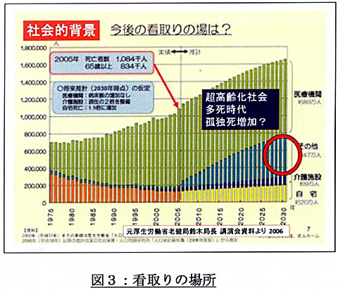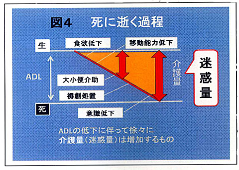 「死に方上手」は「生き方上手」のコツ 船戸 崇史 一番重要なことは、「死に方上手」な人は、間違いなく「生き方上手」でもあるという事でしょう。 なぜなら生き方=死に方ですから。 しかし「生き方」にはあまりに沢山のバリエーションがありますが、「死に方」にはなぜか同じような収束感を感じます。「死」は、個人的能力や個性を超えた何か人間の共通の地下茎に繋がってゆくベクトルなのかもしれません。「死に方」の決まった形をしっかり抑える事は、きっと「生き方上手」のコツだと思うのです。 【敢えて死を見つめる】 誰でも必ず訪れる「死」は、心情的にあまり考えたくないためか、比較的曖昧にして生きている傾向があるのではないでしょうか? 年間、60名以上の在宅死を間近に経験している私でさえ、家族や自分の「死」についてはあまり考えたことはありません。いや、考えないようにしいてるのかもしれません。押して言うなら「その時にならないと分からない」という頭の中のブラックボックスへ入れている(ファイリングしている)かもしれませんね。 しかし、何が起こるかわからない現代、一度でも良いので、「死」から今の自分を見てみることは決して無駄ではない・・どころか、思いのほか深い発見をされると思いますよ。 そうすれば、私も沢山の在宅診療をさせて頂く中で、よく聞く「なぜこんな事になった?・・」「なぜもう少し早く気付けなかった?・・」という、反省とも後悔ともとれる言葉が少なくなるだろうと思うからです。「まさか・・!」はいつもあるという事。「その時にならないとわからない」では、追いつかない時もあります。 さて、「死」を想定した時に、上手に逝くための3つのコツがあります。 【 死に方上手の3つのコツ 】 ![]() 1) 時代背景を理解する 2) 死にゆく過程を理解する 3) 死から今を見て準備する 1)時代背景を理解する 図1を見てください。 日本人口の推移です。江戸時代の300年間は鎖国でした。 よって、日本という国土の中だけで生存可能な人口は約3,000万人だということがわかります。 しかし、明治維新後100年で日本の人口は12,000万人になりました。(100年で人口が4倍以上になることを人口爆発といいます)文字通り日本は人口爆発したのです。しかし一転、図のとおり2004年を人口のピークとして、それ以後は急速に人口減少(収束)の時代(=多死時代=超高齢社会)に入ります。そうです、私たちは、人口収束の時代に生きているのです。周囲は老人で溢れ、老化が原因の病気も当然増えるでしょう。 日本人の3大死因である癌、脳血管疾患、心臓病は、いずれも老化が大きな原因です。また、現在急速に増え社会問題化している認知症や整形疾患(変形性関節症、脊柱管狭窄症、骨粗鬆症など)、白内障から難聴まで原因は老化によるところが大きいと言えます。そして、最後「死」を迎えるのです。このように想像すると、これからの日本は、近未来、周囲は病気や老化による不自由なご老人で溢れかえる時代となるでしょう。 こうした、人口構成への変転の勢いは、これから100年は続きます。 【平均寿命と健康寿命?】 ![]() しかも、図2を見てください。これは、現代日本人の健康寿命と平均寿命のグラフです。平均寿命は男性79才、女性89才。健康寿命は男性71才、女性76才。つまり、男性は78―71=7年間。女性は89-76=13年間は「要介護状態」であるとデータは示しています。現代日本人の平均として最後10年間ほどは、他人(ひと)様(さま)のお世話にならないと(=要介護状態)「死」ねないという事です。 つまり、これからの日本では、急速に老齢人口が増え、その結果多死時代に突入し、これから100年程度後には、明治維新当時の人口(3,000~4,000万人程度)まで減る可能性が濃厚なのですね。しかも人口構成員は老齢者ばかりという事です。 【希望する看取りの場所】 ![]() 次に看取りの場所を見てみましょう。少し古いデータですが、図3は、2006年に国の示した死亡場所の見込みです。2030年、年間の死亡者は160万人を超えると想定され、そのうち47万人もの「その他」が生じうると推定されました。問題は「その他」ってどこ? 勿論、不明です。厚労省の局長は、その時の講演では、「死に場所のない人」と表現されました。 その時に、フロアから「その死に場所のない人への国の施策はなんですか?」という質問がでました。局長の回答は「明瞭(・・)な解決策は、ありません」という明瞭(・・)なものでした。あと16年後ですね。 そして、もう一つ大事なことは現在約120万人の年間死亡者がありますが、その人たちの死亡場所です。約8割が病院で、残りの2割のうち約1割が在宅、1割が施設となっています。もし、「自分の最後は自宅の畳の上で、子供たちに看守られ死んでゆく」なんていう理想を抱くとしたら、それは非常に困難だという事です。それどころか、16年後は、「死に場所」すらない47万人に入らないという保証はないということ。 如何でしょうか?重要なこ