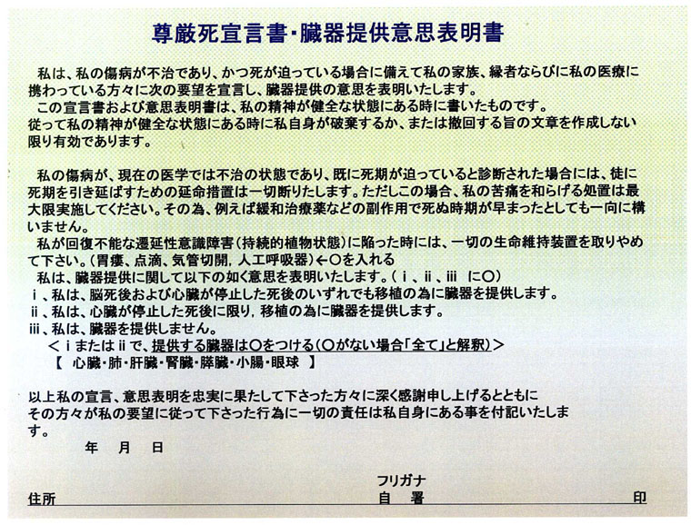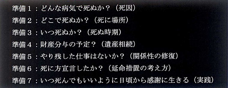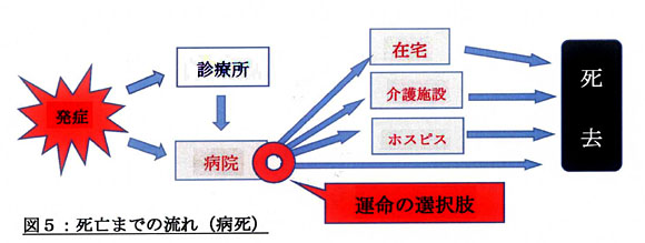 【準備2:どこで死ぬか?】 実は死に場所とは先にも書きましたように、それほど多くはありません。病院、ホスピス、自宅(在宅)、介護保険施設くらいでしょうか。(図5参照) 実は現代日本において多くを占める「病死」は概ね以下のような流れで最期を迎えられておられます。 ![]() 図5のごとく、死に場所は病院、在宅、介護施設、ホスピスですが、そこへ至る途中にほぼ必ず「病院」を経由することが分かります。つまり、病院から次の場所として、在宅も介護施設もホスピスもあるという事です。診療所では、在宅や介護施設での「死」に関わることが多いですが、それでも多くの場合、途中で病院をくぐります。 (上記の「診療所」は、基本的に「無床診療所」を言います) 実は、「途中、病院で治療する」のですが、病院医療は今後ますます急性期医療に特化する方針です。つまり、ずーと病院入院は有り得ません。現在も概ね3ヶ月で退院を迫られます。次なる療養場所は「在宅」か「介護施設」か「ホスピス」となりますが、場所によって特徴(制限)があります。 ホスピスは現在、癌末期かAIDSしか入れません。しかも、救急車での乗り付けもできません。事前予約、エントリーという手間がかかります。入所に概ね1~2ヶ月待ち。(しかし、非常にレベルの高い緩和ケアを実施されています) 介護施設は、老健(老人保健施設)特養(特別養護老人ホーム)グループホーム、ショートステイやその他、サ高住(サービス付き高齢者住宅)なども整備されてきておりますが、医療者の配置も少なく、終(つい)の住まいとなると、特に医療依存度の高い方(気管切開、胃チューブ、中心静脈栄養、人工呼吸器など)は施設側が拒否されるケースも多いです。 在宅ですが、こうした中で現在注目されています。在宅医療の適応は、原則「歩いて通院できない全ての人」が対象です。今後増えるであろう認知症や老年症候群も老化が大きな原因のため、治癒が望めません。つまり治す事が目的の医療の対象ではないのです。在宅医療では、医療者(医師、看護師、歯科医師、薬剤師など)が訪問し、自宅を病室として、家族を看護・介護師としてケアしてもらいます。しかし、家族の負担は大きいです。 実は、最後の死に場所は、途中必ず経由する病院を出る時に、次に行く3つの場所(介護施設、ホスピス、在宅)のどこを選ぶかという選択時に決まったと言えるのです。 【本当に自宅で死にたいならば・・コツ】 先にも書きましたとおり、通常は最期は「自宅」が良いと言われる方が多いです。しかし、重要なことは誰が介護(食事、大小便、更衣、入浴などの世話)をしてくれるかなんですね。 その介護担当者(想像して見てください)と、ご自分の人間関係は良いか否かが最も大切ですね。自分の世話をしてくれるであろうその人との関係が悪いとなかなか自宅へは帰れません。帰っても十分なケアは望めませんね。よって、もし、最後自宅へ帰りたいのであれば、今からケア担当のその人との人間関係改善(修復)を進めておく必要がありますね。介護する人がいなかったり関係改善困難な場合は介護施設とかサ高住という選択肢になりますね。 経験上、関係改善の糸口は「現金」ですね。「毎日笑顔付きで渡す」有効です。 【準備3:いつ死ぬか?(死ぬ時期)】 皆さんはどういう時に「もう死んでもいい!」って思えますか?実は人間、幸せの絶頂時は「死んでもいい」とか「死ぬほど幸せ」と表現します。そうですね、実は死への許可は、苦しい時ではないのです。苦しい時には「死んでも良い」のではなく「死んだほうが良い」と表現しますね。ですから、「いつ死ぬか?」と問われて「今でしょ!」と言えるように、いつ死んでも良いような「幸せな状態」に日頃から「居(あ)る」ことが重要です。 ではどういう状態が「幸せ」なのでしょうか?それは、人まちまちでしょう。しかし、私はその人たちに共通項があることに気がつきました。幸せな人は間違いなく皆さん「笑顔」なんです。これは重要な指標です。笑顔の良い人に悪人はいません。笑顔の人は、今を生きています。笑顔のある人は余裕と信頼と愛と力があります。そして幸せな人はいつも微笑んでいるのです。そして、もう一つ笑顔の持つ力、それは「笑顔は伝染する」のです。笑顔は周囲を照らし励まし希望を与えます。そうです、「笑顔が幸せを運んでくれる」のです。 「いつ死ぬの?」「今でしょ!」と言うためには、宮澤賢治のように「イツモシヅカ二ワラッテヰル*」状態なのです。(*:「雨ニモ負ケズ~」より) 【準備4:財産分与(遺産相続)の予定?】 これは重要ですが、基本的に残す遺産は少ない方が良いのではないかと思っています。多いと、取り分の争奪戦(相続争い)になりかねないからです。少なくては争いようがない。しかし、そもそも遺産とは本当は現金や不動産ではなく、あなた自身の生き様ではないでしょうか?残るものはお金でも、本当に遺したものは、その財産の貯め方だっ