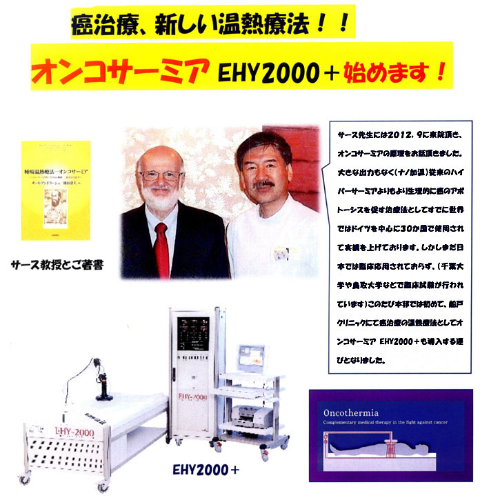 【 最期の願い 】 私の看取りの経験から、人の最期はいずれ来ます。その時に、本人も家族も「もう少し時間が欲しい」と申されることがしばしばあります。最期の願いですね。 私は聞きます。「その時間をどうしたいのですか?」 すると、「昨日と同じようにもう一度だけ、たった一度でいいから、家族で一緒に話し、ともに笑い、食事をして、家族団らんで時を過ごしたいのです」という答えが返って来ることが多いです。・・私たちの平凡な一日です。 実は、皆さんは(私含め)、最期の願いを毎日過ごして見えるのです。その自覚がないだけなんですね。日々まいまいニコニコと生きがいをもって貴方らしく生活する事が、実はあの世の大切な人が最も安心し喜ばれるだけではなく、あなた自身の死の間際の深い願いでもあると言う事を今日から知って生活して頂きたく思います。 きっとそれは、もっとも確かな先祖供養でもあり、あなた自身の自己実現でもあると信じるからです。来年もますます貴方らしさが開花できる年になりますように。 これまで、癌の温熱療法はマイルド加温とハイパーサーミアが癌の温熱療法でした。 これからの温熱療法は、それに加えて「オンコサーミア」という新しい温熱療法が加わります。 今後の癌の温熱治療は、「ハイパーサーミア」と「マイルド加温」そして「オンコサーミア」という3つの癌の加温療法時代の到来です。 ![]() 当院での使用目的は、癌の補完代替医療の1つのツールとして導入致します。従来の高濃度VC点滴療法やリンパ球点滴、還元電子治療とのコンビネーション療法の1つとしてオンコサーミアを導入します。従来のインディバ(局所ハイパーサーミア)も行われますが、どちらか一方となります。その適応は医師の判断となります。また、費用も従来通りです。ただし単独でオンコサーミアEHY2000+のみ行う場合は別途費用を申し受けます。 【 オンコサーミア(Oncothermia)とは? 】 私が提案する免疫生活の9か条に「体を温める」=「加温生活」という内容があります。 今回は、新規導入する、新しい温熱治療器の紹介です。 先日まで行ってきましたドイツ視察は、まさにこの新しい温熱治療器を導入した病院やクリニック見学がメインテーマでした。新しい温熱治療、それは「オンコサーミア」という温熱療法です。従来のハイパーサーミア療法の一つに位置づけられていますが、根本的に思想が違います。 従来のハイパーサーミアは、癌細胞は42,5度以上の高温では死滅(ネクローシス)を起こすことを応用した治療法です。しかし、腫瘍が体の内部にあるとなかなか熱が浸透しないため、体に無害な電磁波を発生させて体の深くまで輸熱(ジュール熱)する方法が考えだされたのです。しかし、実際は生体では血流があり、温度が上がれば上がるほど血流量が増え、その結果、折角加温した深部局所の熱が血流で押し流され、熱が下がるという現象が生じました。その為により機械の消費電力を上げ、もっと局所をより高温化する必要がありました。しかし同時にそれは熱傷や強い不快感(苦痛)を感じることでもありました。 基本的に、そこまで電力を上げなくとも、細胞膜に適切な電流(ナノ電流)を流せば、細胞膜の外部信号経路で細胞の生理的死滅(アポトーシス)が生じる事を発見し、より生理的な温熱療法を開発したのが、ハンガリーのサース・アンドラーシュ教授(セント・イシュトバーン大学)です。特に腫瘍治療に応用されることから腫瘍を意味する「オンコ」と、温熱治療を意味する「サーミア」を合成して「オンコサーミア Oncothermia」と命名しました。 サース教授は、癌細胞の死滅(ネクローシス)を目指すのではなく、生理的死滅機構(アポトーシス)を目指し(より生理的)、本来の「自己のもつホメオスタシスの活性化と再生が重要」であると述べておられます。