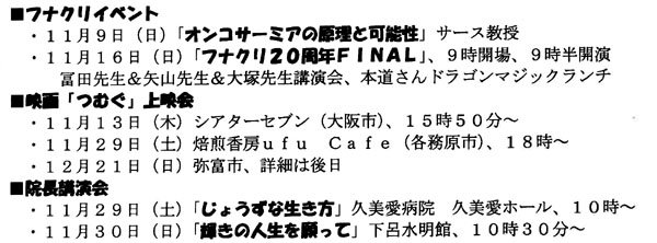 生き方の心構え 船戸 崇史 今年も残すところあとわずかとなりました。 沢山の出会いと別れ。特に、「終末期を何とか在宅で生き切るサポートしたい」という在宅医療を展開する中で、一際深く思う事があります。 それは、人の「死」の受け止め方、死後の心構えです。 【 母の死 】 私も、大好きだった母親を20年前に白血病で亡くしました。「余命半年ですね」と言われ、その通り半年で帰らぬ人になりました。61歳でした。 強い抗がん剤のためにクリンルームに入り、外界とは遮断。食事も生もの禁止。私たちもガウン、マスクをしての面談で、きっと母親も辛かったと思います。しかし、抗がん剤の効なく、治療は中止されました。同時に閉鎖空間のクリンルームから退出できたのですが、複雑な思いで退院しました。その後まもなく、脳卒中で私の病院へ救急搬送されました。医師として、息子としてやるべきことは全てしました。母親は私の手の中で還らぬ人となりました。大切な人を亡くした、この時の精神的なショックは大きく、こんな非道理な事があっていいものかと涙と後悔の毎日だったとことを記憶しています。泣けど泣けど涙は尽きず、一体どこからこの涙が出るのかとすら思いました。 【 父の死 】 そして、父の死です。父は、地方の政治家で12年前に交通事故で亡くなりました。69歳でした。母親と違い、一瞬で居なくなるショックは甚だしいものでした。H13年、12月31日の大晦日に、私の息子が足を骨折して例年のお正月を実家に行けなくなったからと、父がお年玉をもって養老まで来てくれました。平素、超多忙な父親でしたが、この日は珍しく、養老の我が家でゆっくりして、一言「体を大事にせなあかんよ」という、いつも言ったことのない 翌日、妹から父が帰っていないと電話が入り、しばらくして父親らしい人物が車ごと用水路に転落して亡くなられている旨の電話を警察から貰ったのでした。 悲しさよりも、ショックのあまり受け止める事すらできませんでした。涙も出ません。思えば母親の死は、病状の進行に伴って、きっと心の準備もできて行ったのかもしれません。父の亡骸に接し、葬式と言う一連の儀式をとおして、徐々に離れていた私の心は体に重なり、現実として受け止めざるを得ませんでした。これで、私を世界で最も認め愛してくれる存在(両親)はいなくなったという、何とも切なく辛く寂しい思いが涙となって、母親の時とは違う涙が怒涛の如く流れた事を覚えています。この時に、「事故死はいけない・・もうすこし、時間をかけてほしい」とも思いました。 その思いを 1つ目は、世に生きる殆どの人々が、その両親や大切な人を亡くし、それでもなお今日を生きているという姿でした。この時ほど、全ての人に感動し尊敬の念を持った事はありません。普通に道歩く人々の存在こそが大きな癒しとなりました。 2つ目は、兄弟の存在です。私は3人兄弟の2番目ですが、同じ親を亡くした辛さは、自分だけではなく、兄や妹も辛いはずです。同じ思い出話もできました。ですから、兄弟と一緒にいると言う事が癒しでもあり、親亡きあとを親の分まで生きると言う願いを兄妹とともに心に刻みました。 両親を亡くして何年かする中で、あの時の涙は流れなくなりました。傷が癒えたかと言うと薄紙をはぐように薄くなっていったという感じでした。しかし、伴って、両親ともいつも傍にいると言う感じもしてきました。 今でも、困った事があると、ついつい両親に聞いています。「・・これで良いのか?」 すると、いつも「あんたが良いようにしんせいよ」(貴方が良いようにしなさいよ)と言って、父も母もニコニコ笑いながら応えてくれます。 間違いない事は、両親とも死してなお存在感があると言う事です。そして、いつもこちらの様子を愛をもって眺めています。だから、いつも応えてくれるのでしょう。 私もいずれ逝く時に、「ただいま」といって、胸を張って還れるように今を生きたいと願うようになっています。その時が楽しみでもあります。 こうした自分の経験と、在宅での看取りも750人を超え、少しずつ「死」について分かってきたことがあります。 【 死から学んだこと 】
