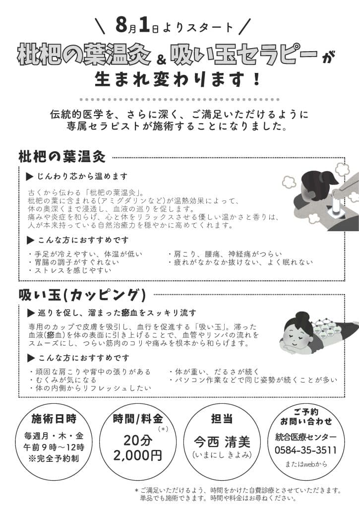 8月1日から「枇杷の葉温灸&吸い玉セラピー」が生まれ変わります!