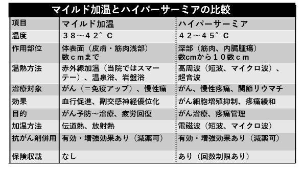 最後に、当院で実施しているがん治療としてのハイパーサーミアとマイルド加温につき、比較表でまとめてみました(図5)。