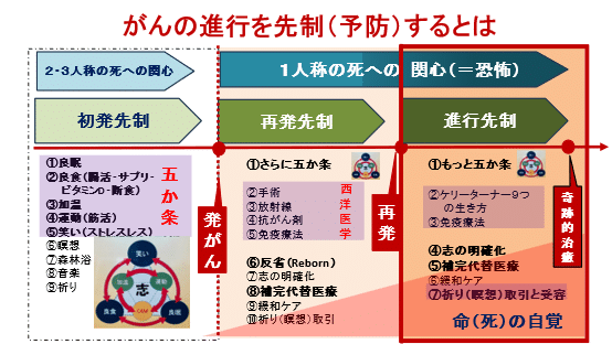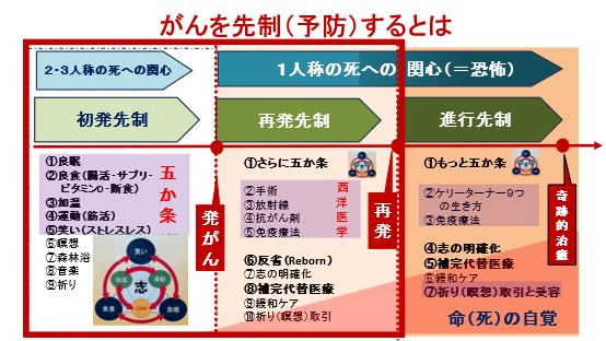 その上で、私は手術、放射線、抗がん剤はとても有用な方法論の一つだと思っています。身削ぐ行為が確実にできるから。これを西洋医学的な治療行為と言いますが、実はこの治療行為は再発を先制(予防)するための行為とも言えるんですね。そして、再度の五カ条の見直し(反省)による新しい、あなたオリジナルの生き方がとても大事になるんですね。