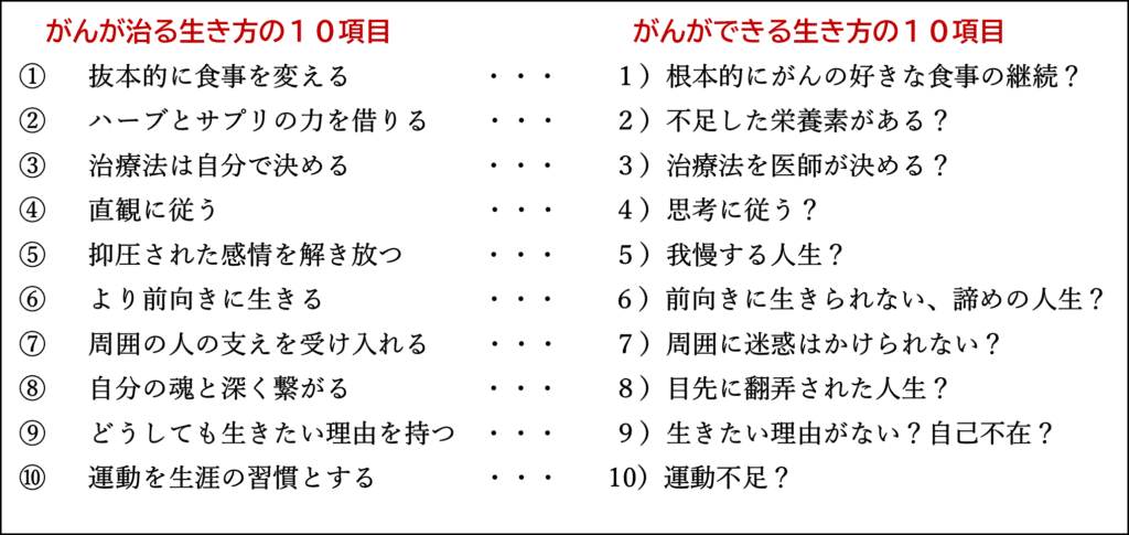 これら項目では①②⑩は肉体的要件と言えますが、③⑤⑥⑦⑨は精神的要件、④と⑧は魂的要件と言えそうですね。きっとこの中ですぐにでも始めることが出来る項目が、①②⑩ですよね。がん前の食事(その結果栄養も不足?)、運動しない習慣が大きくがんを促していたというのは朗報ですよ。先にも書きましたが、がん前にこそ食事と運動のヒントがありますから、それを変えるだけで、間違いなくがんから離れることになります。しかし、精神的、魂的な項目は、どうしたらよいか?とまた思考が先立ちます。ですから、心の癖はまず気が付くことが大事だと私は思っています。そして、皆さん見られて意外と思われることは、どこにも「がんを消す」という手段が含まれないことですね。そうです、繋がるのは本来で本当の自分であり、それが深まれば深まるほどどうも勝手にがんは消えていくことになるようだという事なんですね。