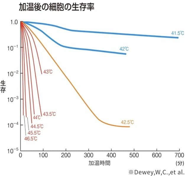 私も在宅医療の現場で、人間として生きる上での必須の生活サポートと言えば食べる事と排泄のサポートです。しかし、思いのほか喜ばれる在宅サービスが入浴です。自然災害の被災現場でも入浴するサービスが行われるのは日本くらいだと言われます。日本における入浴文化は、日本が雨水も多く水が潤沢にあり、よって湿度も高く身体を芯から温める方法として適している事、また火山国で温泉も身近にあった事なども関係していると言われています。何より、お風呂に入った時のあのほっこり感はシャワーでは感じられないリラックス(ストレス発散)効果として誰もが感じるのではないでしょうか。温熱には実はその他にも血流の改善、筋肉の緊張緩和、鎮痛効果、免疫賦活効果もあります。さらに、42.5度以上の高温では、直接がん細胞を死滅させる効果も分かってきました(図1)。また実はそこまで高温でなくとも42度以下での加温治療法(HSP温熱治療法)でもがん治療として有効であることもHSP研究者の伊藤要子先生らが詳細に研究し報告しています1)。