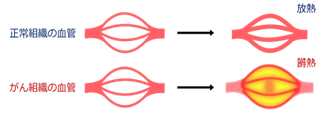 しかし、この現象はがん細胞だけではなく正常細胞にも同様の変化が起きます。なぜがん細胞に特異的なのかというのは、がん腫はその血管もがん細胞で出来ており、熱により正常細胞の血管は拡張して熱をフラッシュアウトできる一方、がん腫の血管は拡張できず腫瘍内は鬱熱状態となり細胞内が高温になりやすいという仕組みがあることは皆さんもご存じの通りですね(松波総合病院HPより図2)。